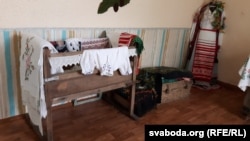 — А цяпер тут — «Сьвет побыту колішняга сялянства». Экспанаты зьбіралі ўсёй грамадой па навакольных вёсках. Вось і стол дубовы нам дзядок мясцовы падараваў. А тут і кросны, і прасьці можна. Калаўроты, розныя глякі, збанкі, нават масла зьбіць можна. Усе гэтыя экспанаты дзейныя, і мы час ад часу такія рэчы практыкуем. Мы імкнуліся ахапіць усе бакі вясковага жыцьця.