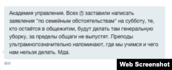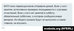 «У сувязі з Днём Волі тыя, хто жыве ў інтэрнатах, абавязкова павінны ісьці туды і нікуды не выходзіць, а менчукі застаюцца ў навучальных карпусах да 16.00. Тлумачаць, што гэта „суботнік“, які доўжыцца 4,5 гадзіны пры зачыненых дзьвярах корпусу. Заявы „ў сувязі з адʼездам да бабулі“, „па сямейных абставінах“ не прымаюцца».
