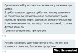 «Пасьля заканчэньня пар нас вязуць ці то на хакей, ці то на футбол нейкі, — піша ў твітэры студэнка зь МІТСО. — Прыгражаюць адлічэньнем у выпадку прагулу. Пры гэтым выхваляюцца (адміністрацыя. — РС), што яны ў Балёнскім працэсе і па-за палітыкай».