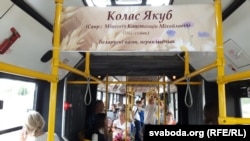 Звонку на аўтобусе партрэты Янкі Купалы і Якуба Коласа, згадкі пра Дзень беларускага пісьменства, які сёлета праводзіцца ў Рагачове. Усярэдзіне — інфармацыя пра творцаў: Максіма Багдановіча, Якуба Коласа, Уладзімера Караткевіча, Ніла Гілевіча, Максіма Танка, Анатоля Грачанікава.