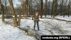 «Глядзіце: вось дрэвы з намаляванымі вачамі ўздоўж дарогі. Гэта тыя, якія абяцаюць пакінуць. А далей тырчаць абрэзкі і пні з чырвонымі плямамі — гэта ужо зона зьнішчэньня. Усяго ім трэба сьпілаваць 49 дрэваў. Дык яны кажуць, маўляў, ёсьць дазвол, але яго тут ніхто ня бачыў, бо не паказваюць. Усяго за два дні тут зьнішчылі 4 дрэвы, а яшчэ адно паспрабавалі, але недапілавалі. Бо людзі пачалі яго абдымаць, таму не атрымалася.