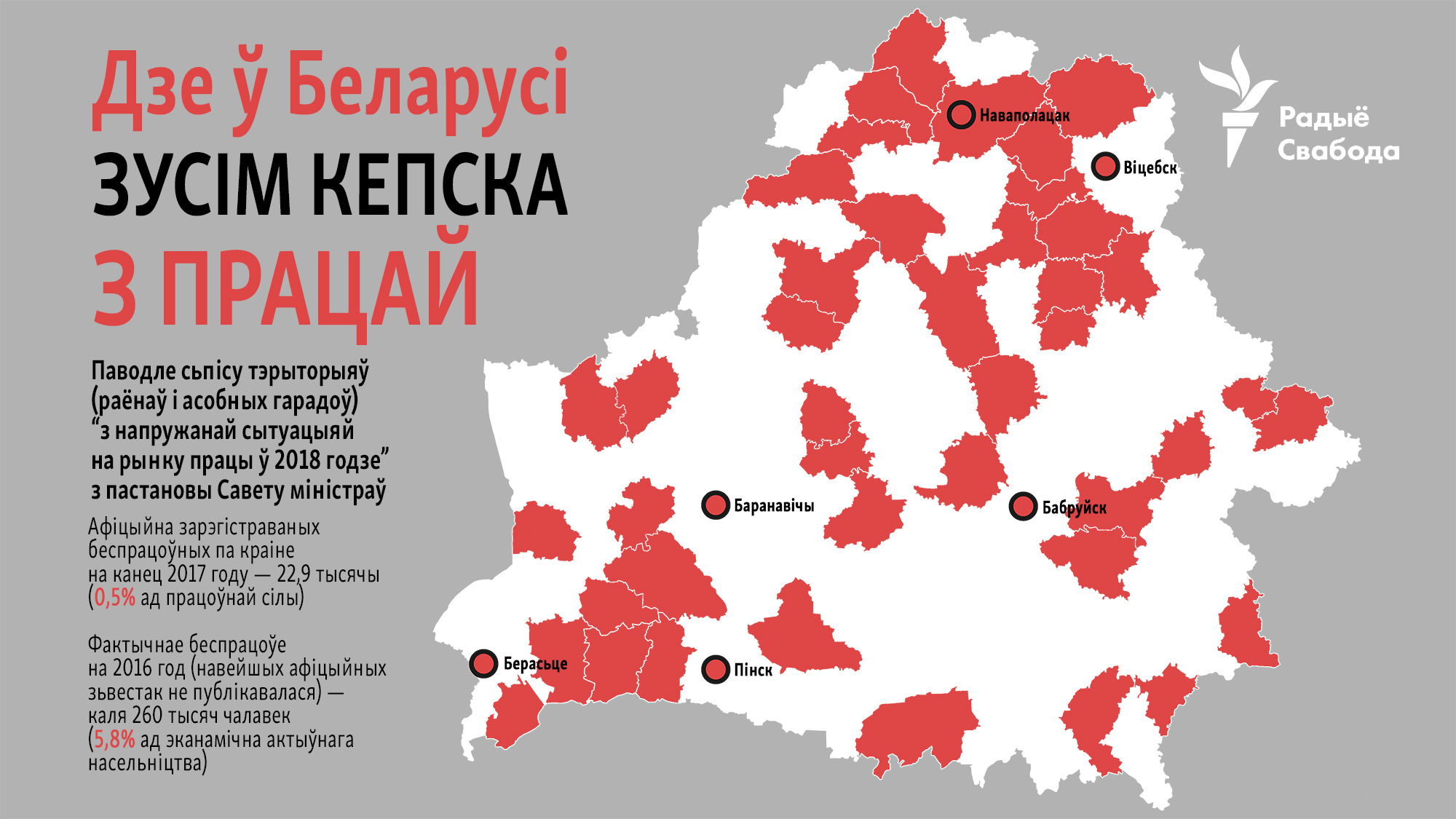 Такія тэрыторыі вызначаюцца з афіцыйнай статыстыкі, справаздачаў ведамстваў і зьвестак адміністрацыяў. Улічваюцца ня толькі афіцыйна зарэгістраваныя беспрацоўныя (такіх было ўсяго 22,9 тысячы чалавек на канец 2017 году), але і фактычна беспрацоўныя (іх у Беларусі каля 260 тысяч), а таксама тыя, хто «працаваў у рэжыме вымушанай ня поўнай занятасьці» і ў «цэладзённым прастоі».