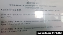 На пачатку паседжаньня судзьдзя Васіль Петрыў заявіў, што дзьве справы Грыка — за брыдкаслоўе і несанкцыянаваны пікет — аб’яднаныя ў адну.