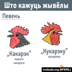 Беларускі певень крычыць кукарэ́ку, кукарэкае. Але зважае і на дыялектныя адрозьненьні. Таксама разнастайныя перайманьні іншых птушыных галасоў.