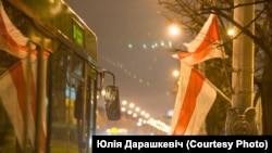 Бел-чырвона-белыя сьцягі ў цэнтры Менску.