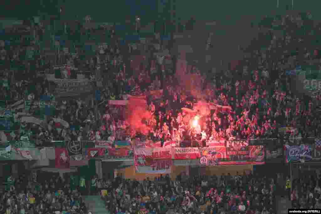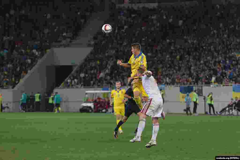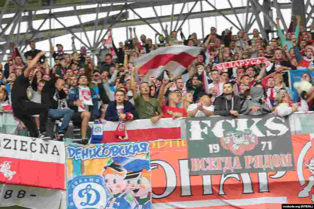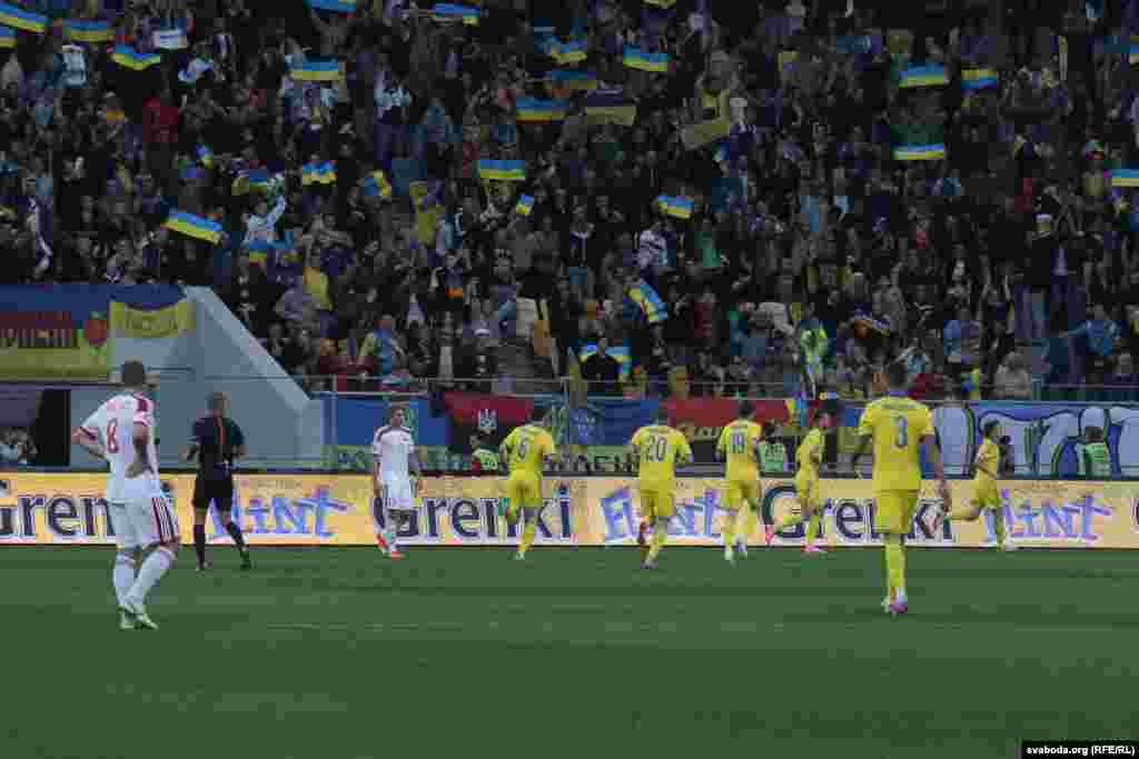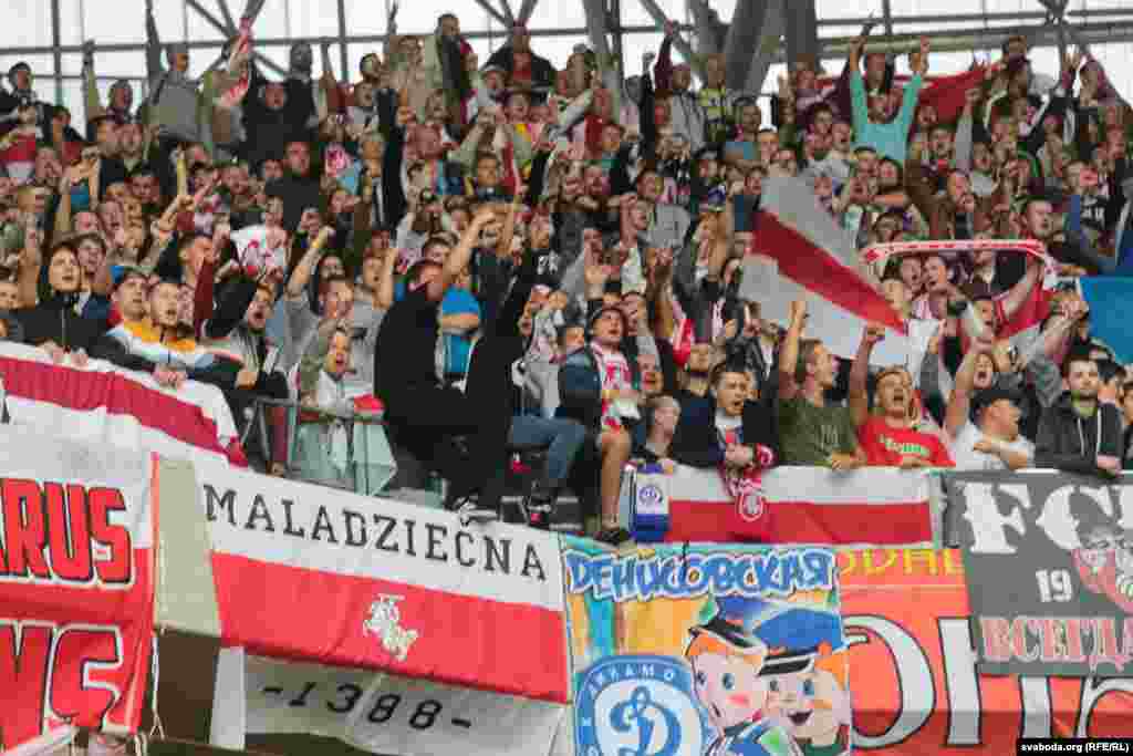 Сёньня ў Львове зборная Беларусі гуляла матч адборачнага этапу Чэмпіянату Эўропы па футболе 2016 года. Яшчэ задоўга ўвага да гэтага матчу была прыцягнутая менавіта праз фанатаў. Як і чакалася, нават супрацьлеглыя сэктары маюць агульныя крычалкі. Матч завяршыўся лікам 3:1 на карысьць Украіны. Украінская зборная мела перавагу цягам усёй гульні. Нягледзячы на гэта, атмасфэра на трыбунах была сяброўская. Бальшыня сьцягоў на трыбунах — украінскія жоўта-блакітныя, і беларускія — бел-чырвона-белыя.
