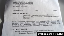 Тым ня меней, прысуд агучаны на падставе нібыта праведзенай экспэртызы матэрыялаў. І вэрдыкт: адмовіць у выдачы сэртыфікату, паколькі вынікі творчай дзейнасьці не адпавядаюць вызначаным крытэрам. А наступным разам для большай вагі рэкамэндавана прадставіць зьвесткі пра зладжаныя выставы, а таксама водгукі ў прэсе:
