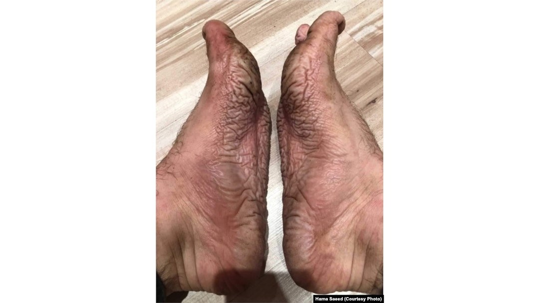 Мужчына паказаў фота ступняў, якія доўгі час былі вільготнымі ў лесе, а таксама высыпку на руках пасьля падарожжа на мяжу. Таксама ён даслаў відэа, дзе відаць, як яны чэрпалі ваду, каб піць, зь непразрыстай ракі.
