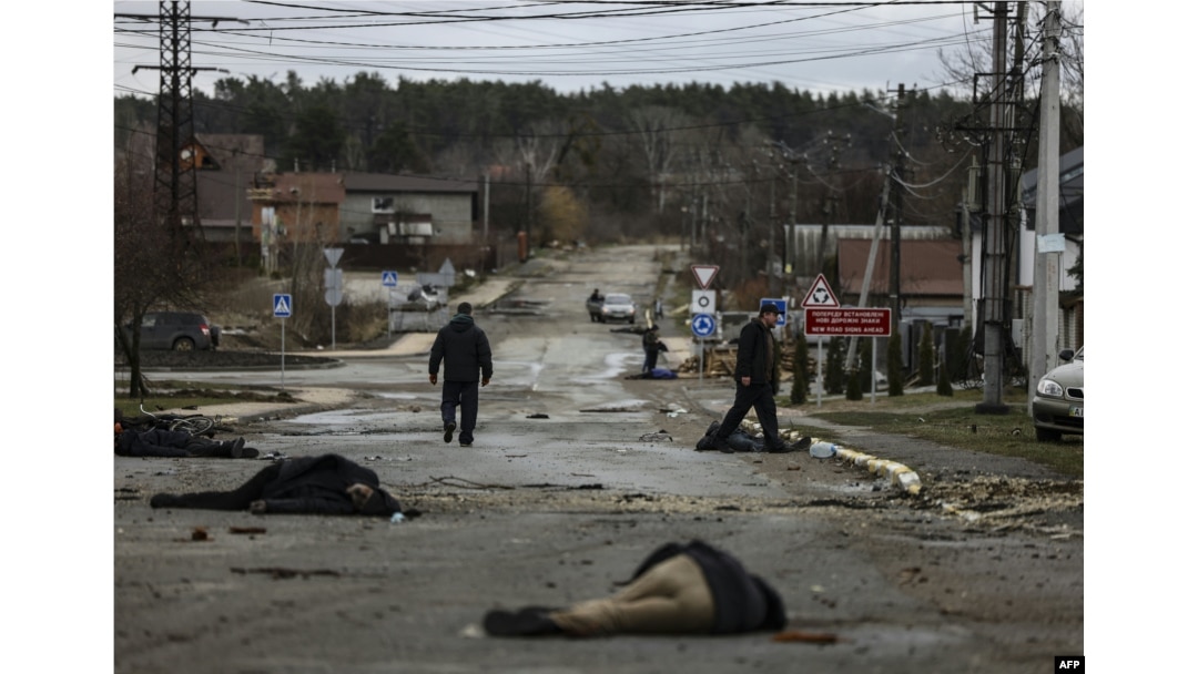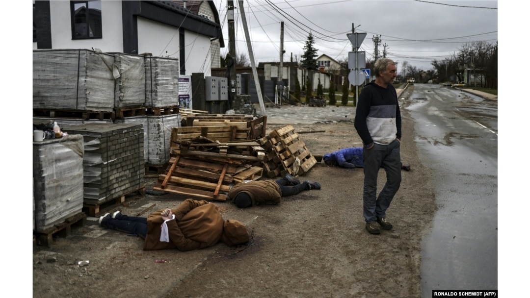 «Загінулыя мірныя жыхары на ўзбочыне ў 20 км ад Кіева, Кіеўская вобласьць, Украіна, 2 красавіка 2022 году. Адзін мужчына і 2-3 мёртвыя голыя жанчыны пад коўдрай, усіх разам спрабавалі спаліць на ўзбочыне», — напісаў фатограф.