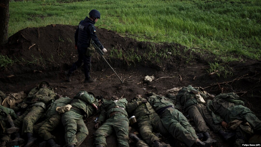 Украінскі сапэр шукае міны каля забітых расейскіх салдат, ваколіцы Харкава, 9 траўня 2022